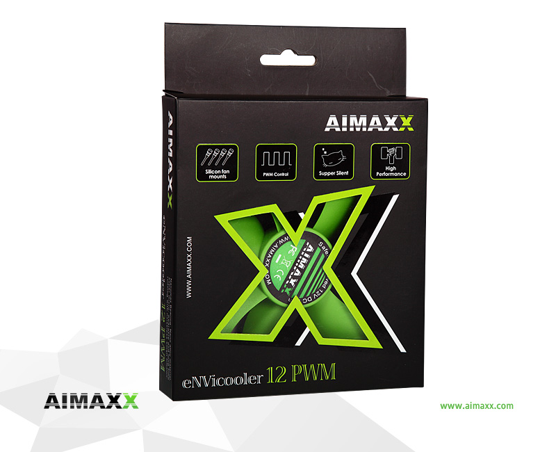 Reliability, silence and attractive fresh design – these are AIMAXX eNVicoolers. Fans are all equipped with Nanomaxx bearing. This AIMAXX patented bearing is made of super thin, extra durable material, guarantees longtime life with very small friction for low noise. The whole series is packed in eye-catching green-black window blister color box for easier presentation to customers. Fan includes 4 pin PWM connector for easy monitoring function. Special green silicone anti vibration screws are package included.