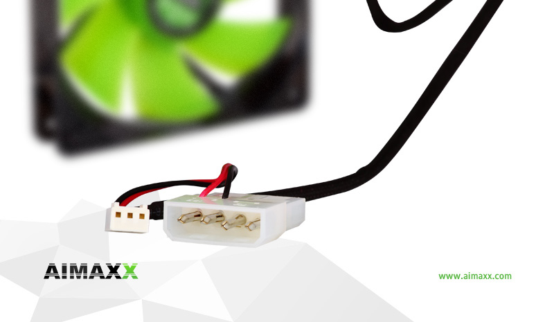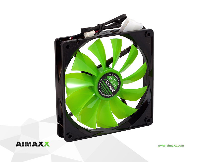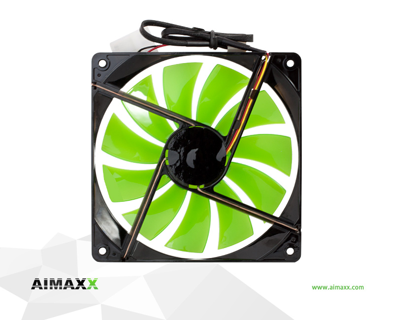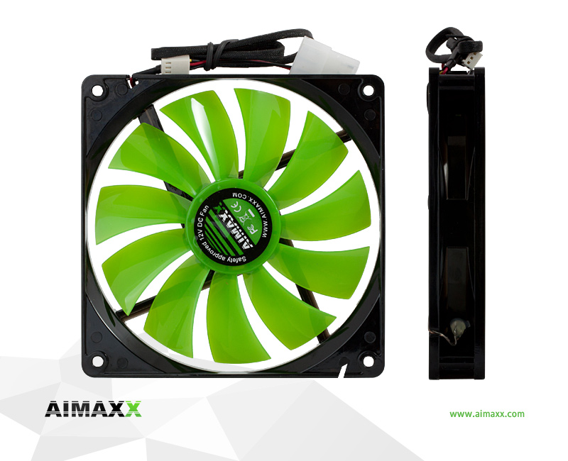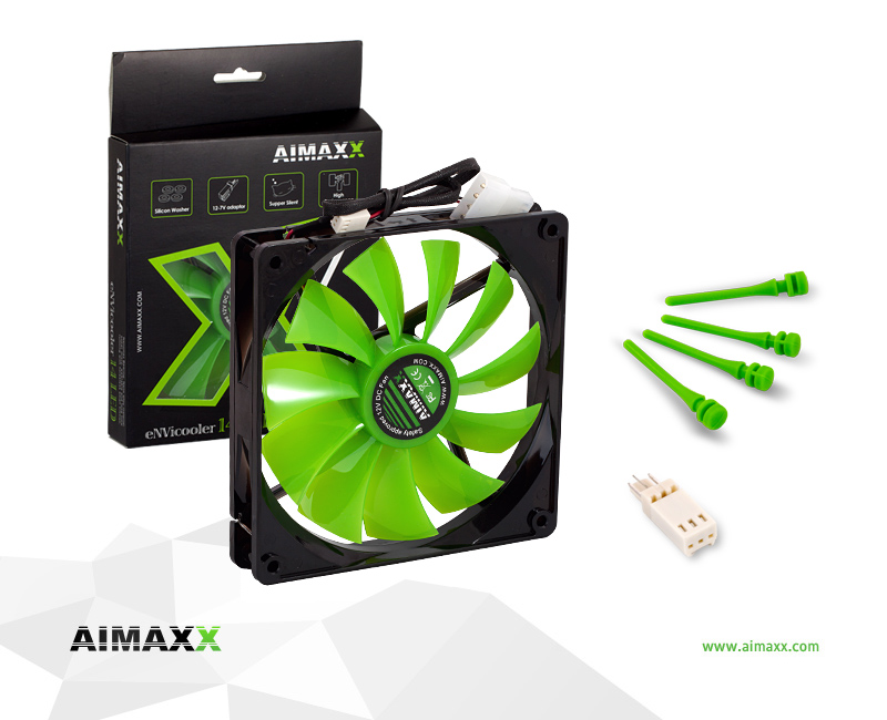 Reliability, silence and attractive fresh design - these are AIMAXX eNVicoolers. Fans are all equipped with Nanomaxx bearing. This AIMAXX patented bearing is made of super thin, extra durable material, guarantees longtime life with very small friction for low noise. AIMAXX fresh green color is emphasized by attractive LED green underlight. The whole series is packed in eye-catching green-black window blister color box for easier presentation to customers.