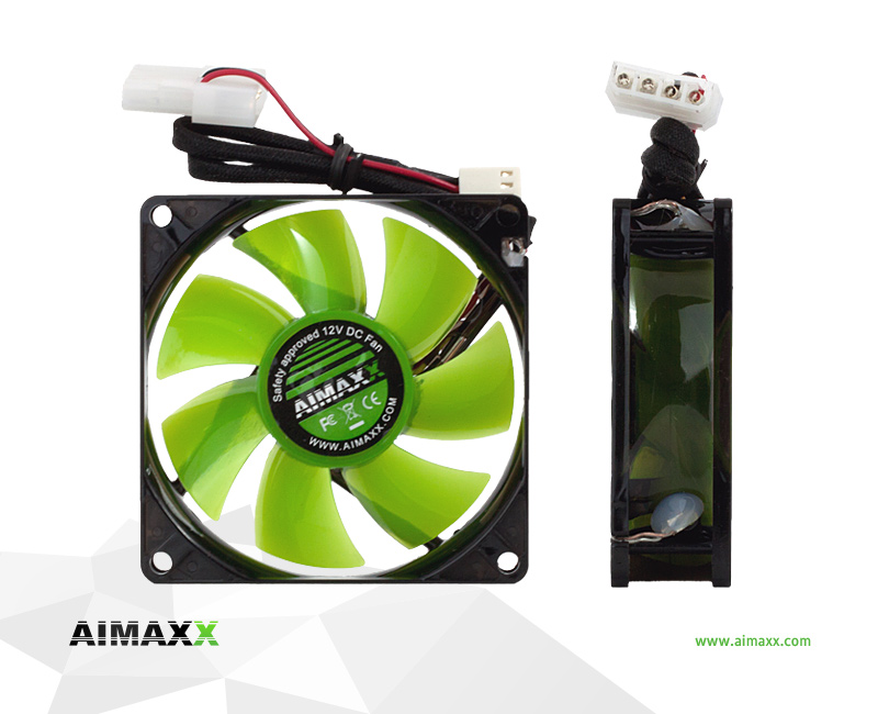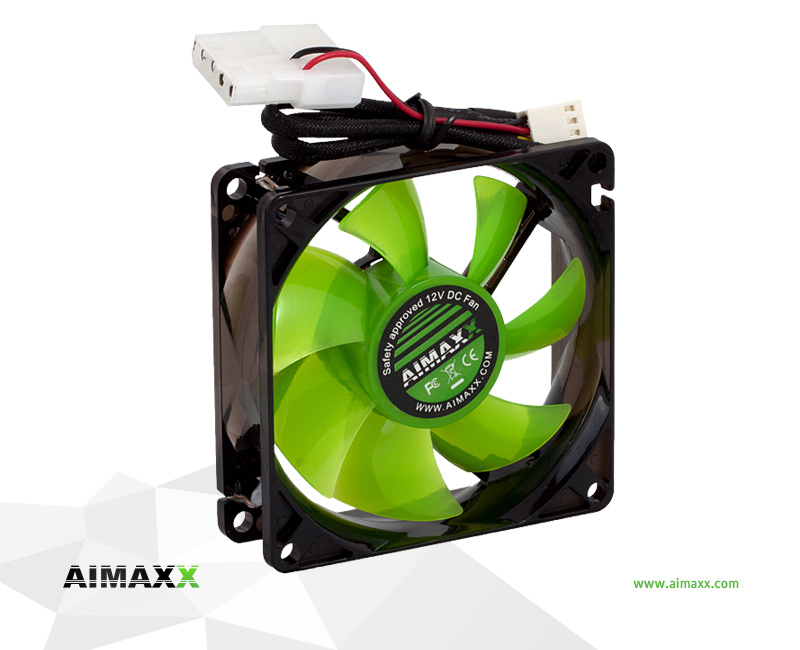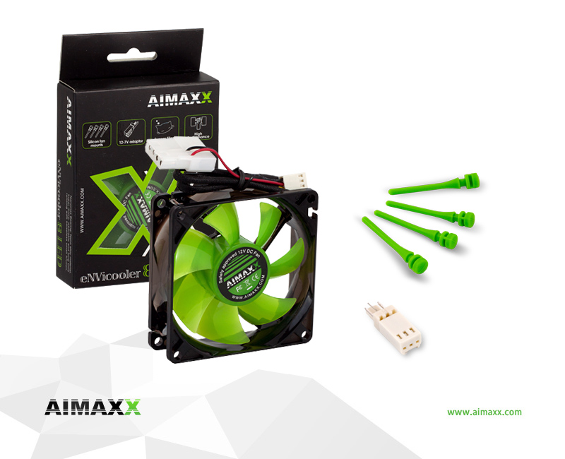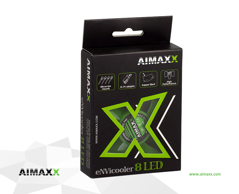 Reliability, silence and attractive fresh design - these are AIMAXX eNVicoolers. Fans are all equipped with Nanomaxx bearing. This AIMAXX patented bearing is made of super thin, extra durable material, guarantees longtime life with very small friction for low noise. AIMAXX fresh green color is emphasized by attractive LED green underlight. The whole series is packed in eye-catching green-black window blister color box for easier presentation to customers.