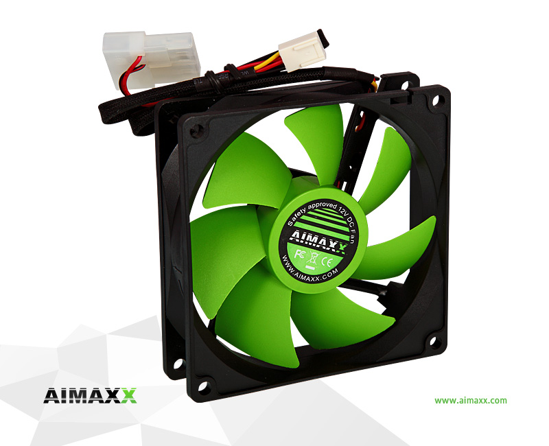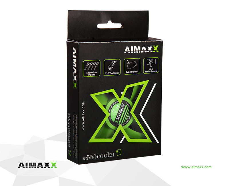 Reliability, silence and attractive fresh design – these are AIMAXX eNVicoolers. Fans are all equipped with Nanomaxx bearing. This AIMAXX patented bearing is made of super thin, extra durable material, guarantees longtime life with very small friction for low noise. The whole series is packed in eye-catching green-black window blister color box for easier presentation to customers.