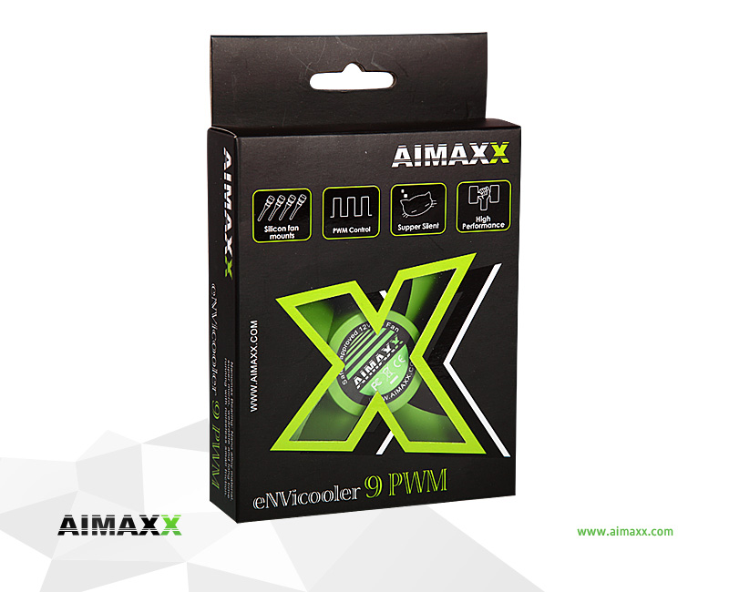 Reliability, silence and attractive fresh design – these are AIMAXX eNVicoolers. Fans are all equipped with Nanomaxx bearing. This AIMAXX patented bearing is made of super thin, extra durable material, guarantees longtime life with very small friction for low noise. The whole series is packed in eye-catching green-black window blister color box for easier presentation to customers. Fan includes 4 pin PWM connector for easy monitoring function. Special green silicone anti vibration screws are package included.