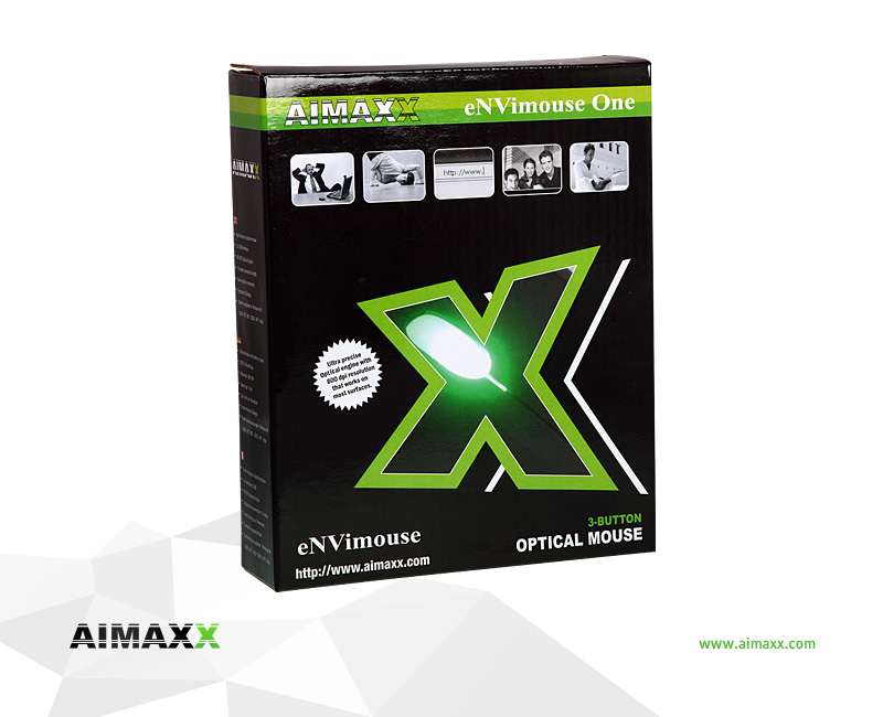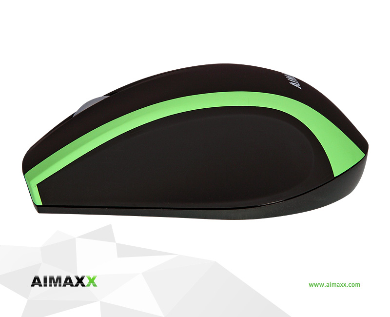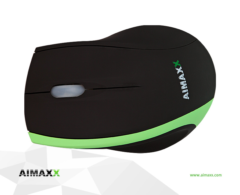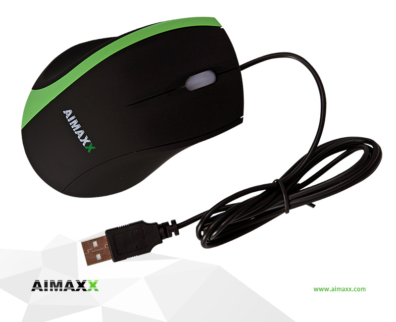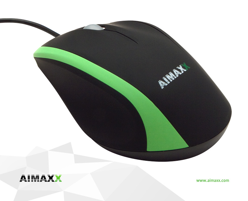 Considering the need of comfort and reliability and not forgetting about the elegance, AIMAXX created this high-end 3D USB optical mouse. The ergonomic design, rubbered surface and fresh green under light of scroll wheel makes together the “mousing” very pleasant job.