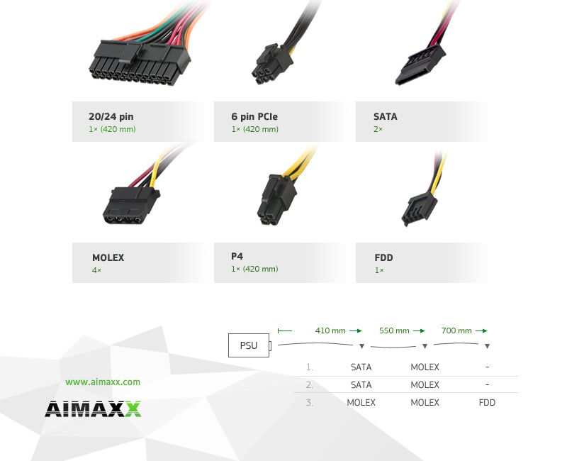 Reliability and silence – these are two words that can briefly introduce the AIMAXX power supplies. High quality components and thoughtful structure of the PSU guarantees longtime live, that is supported by the choice of silent but powerful 120mm fan inbuilt. Entire set of cabling meets with all actual market requirements.