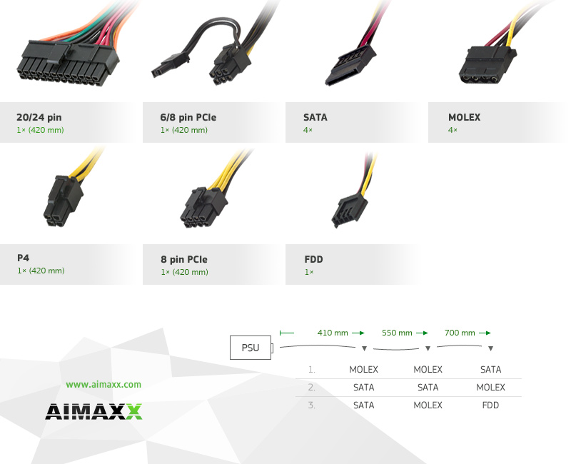Reliability and silence – these are two words that can briefly introduce the AIMAXX power supplies. High quality components and thoughtful structure of the PSU guarantees longtime live, that is supported by the choice of silent but powerful 120mm fan inbuilt. Entire set of cabling meets with all actual market requirements.
